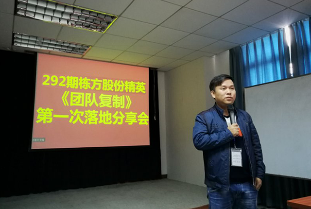 2017年11月23日,棟方股份精英《團(tuán)隊(duì)復(fù)制》第一次落地分享會在公司員工培訓(xùn)室舉行,與會人員除公司邱副總經(jīng)理、黃副總經(jīng)理、人事行政中心胡總監(jiān)及各精英團(tuán)隊(duì)負(fù)責(zé)人之外,還有幸邀請到聚成金牌講師李經(jīng)理一行蒞臨指導(dǎo)。